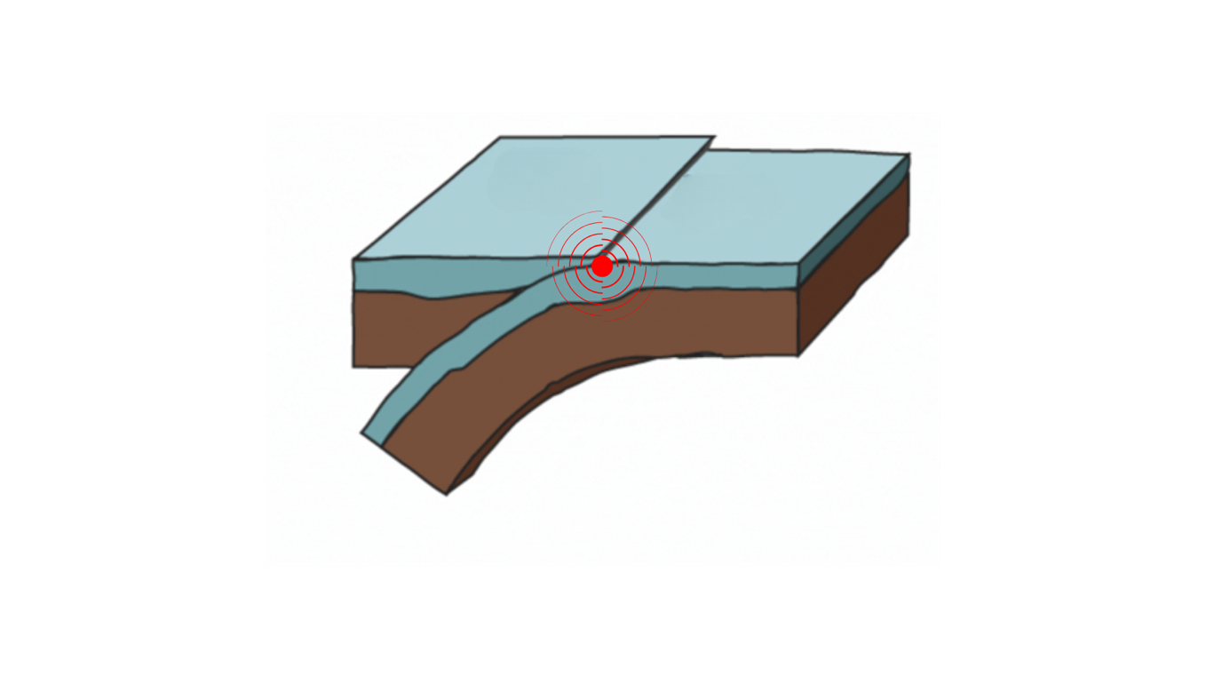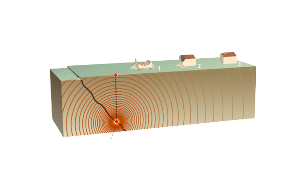 Le lieu de la fracture en profondeur s’appelle le foyer. Les vibrations libérées se propagent tout autour du foyer en ondes sismiques. Ces ondes font parfois trembler le sol et peuvent endommager les constructions. C’est à la verticale du foyer (par rapport à la surface de la Terre), que le séisme est le plus puissant, on appelle ce point l’épicentre.