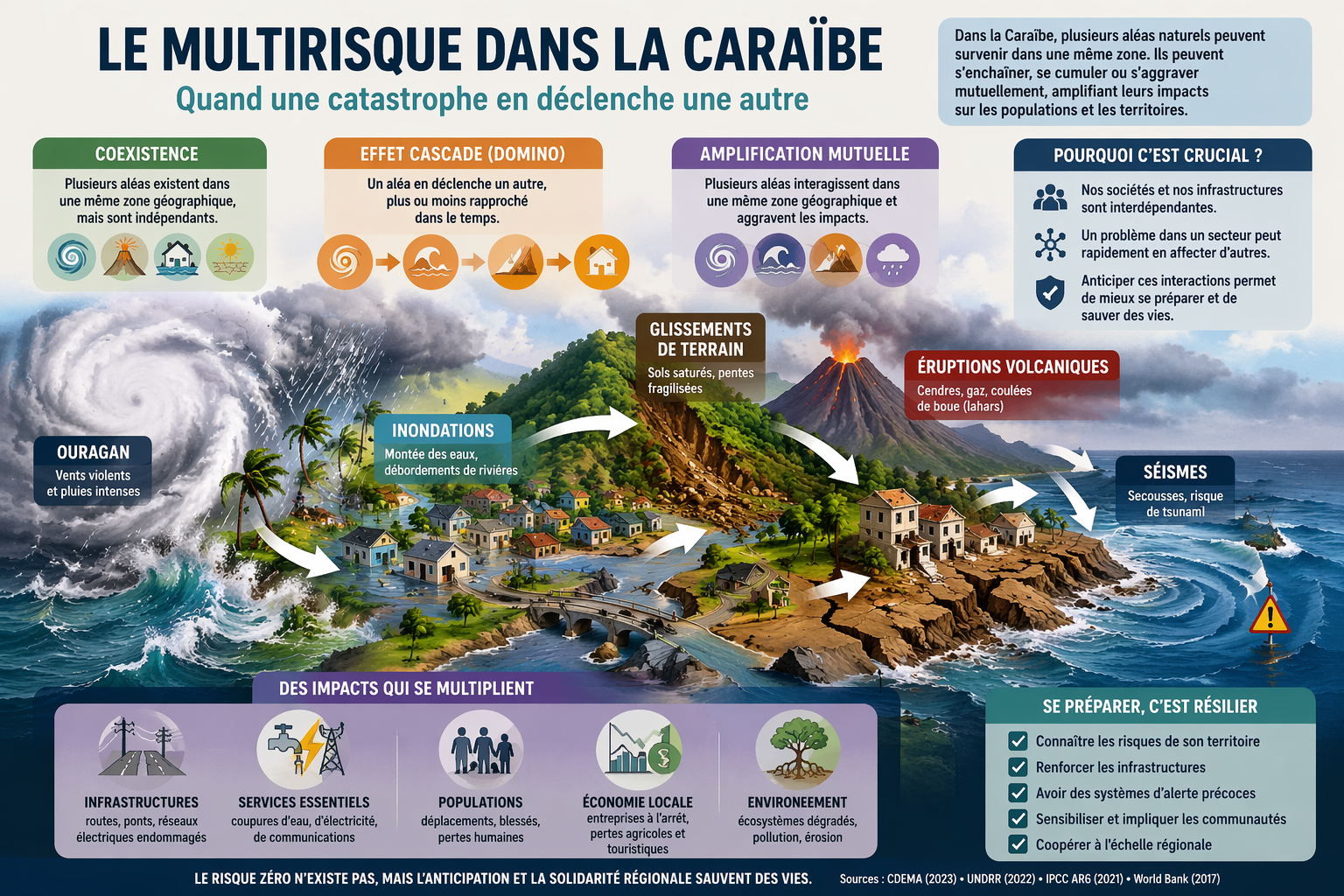 Dans la Caraïbe, les catastrophes ne surviennent pas toujours de manière isolée, c’est que l’on appelle le multirisque. Elles peuvent s’enchaîner, se cumuler, ou même s’aggraver mutuellement.